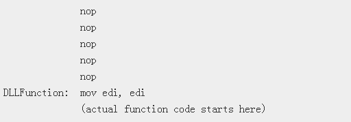在32位x86平台上,从DLL导出的一些函数将以一条不执行任何操作的两字节指令(mov edi, edi)开始,并且在此(nop或int 3)之前有五条未使用的一字节指令,例如: