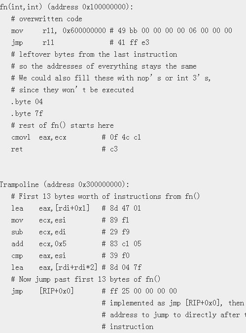 3.由于我们使用jmp从fn()返回到修复函数,而不是ret,并且类似地从蹦床返回到fn()的主代码,这使代码堆栈保持中立。因此,调用其他函数和从fn()返回都可以正确地处理堆栈的位置。
