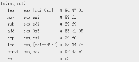 否则,事情会变得更加复杂。以x64的情况为例。跳转到已修复函数的指令需要13个字节:10个字节用于将地址加载到寄存器中,3个字节用于跳转到该寄存器的位置。因此,拦截器需要将至少前13字节的指令移动到一个蹦床函数中,如果需要的话,还要加上完成最后一条指令所需的足够的字节。之所以被称为蹦床,因为通常代码会跳转到那里,这会导致一些指令运行,然后跳转到目标函数的其余部分。让我们看看一个真实的示例,下面是我们要截取的一个简单函数,首先是C源代码(Godbolt编译器资源管理器链接):