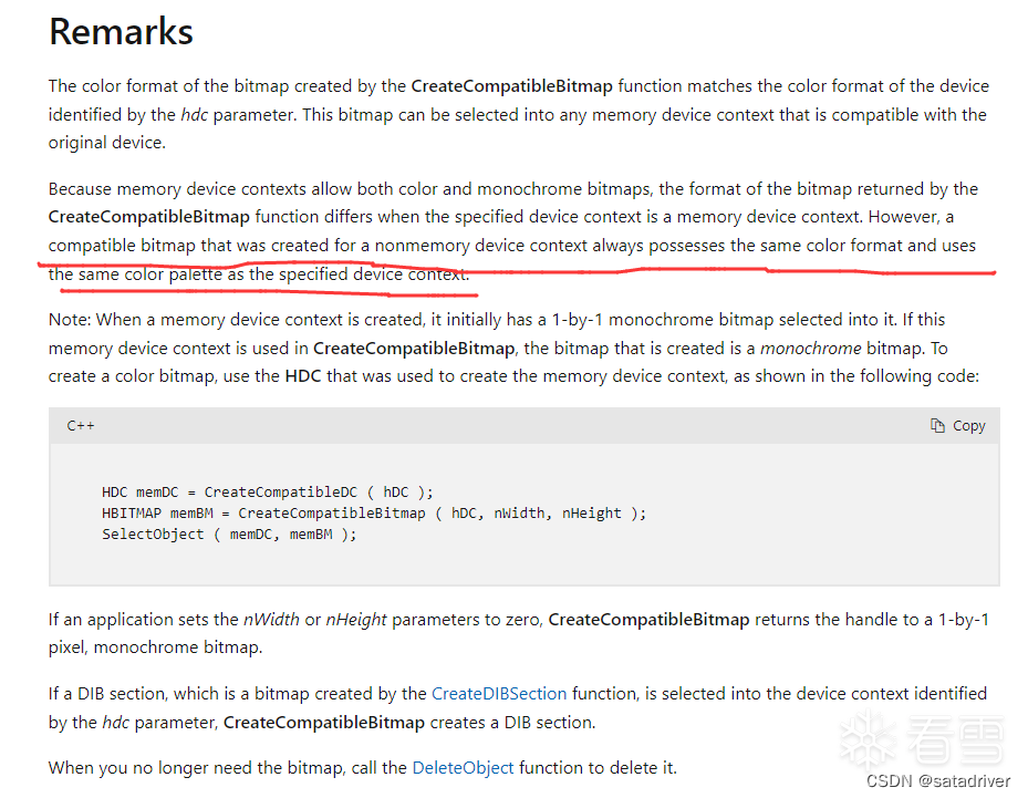 (2) CreateCompatibleBitmap函数中的HDC要使用桌面的HDC,而不能是新创建的内存hdcmem,这是一个隐蔽的知识盲点,microsoft的解释如下: