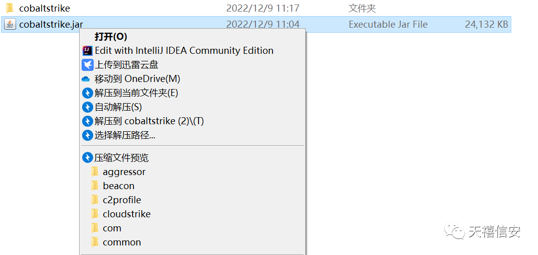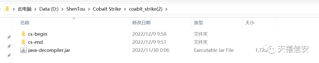 然后将 coablt_strike 拷贝到进行二次开发的目录中,再新建两个目录(这里我命名为 cs-begin和 cs-end ),其中 cs-begin用来存放未反编译的 Cobalt Strike , cs-end 用来存放反编译后的源码,因为这里我们是对原版 Cobalt Strike 进行二次开发,所以文件夹中不存放 CSAgent (Cobalt Strike 破解工具),只放入 cobaltstrike.jar ,再把 java-decompiler.jar 放在你需要反编译的jar包路径的上级目录