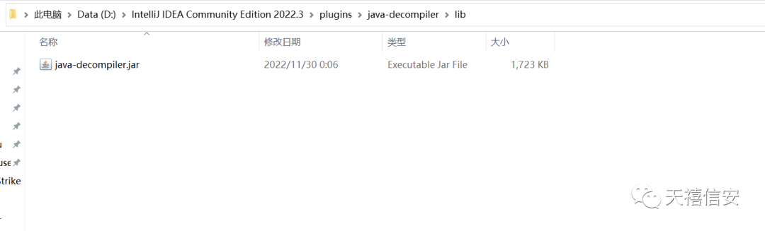 首先我们先找到 IntelliJ IDEA 中的 java-decompiler.jar 文件,java-decompiler.jar 是 IntelliJ IDEA 自带的反编译插件,一般存在此目录下:
