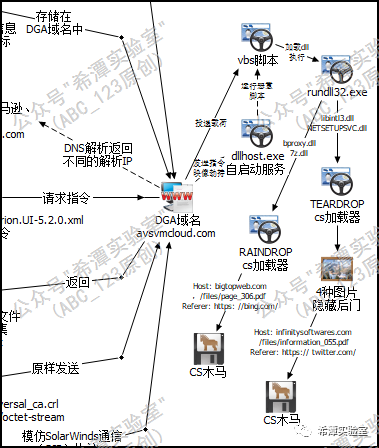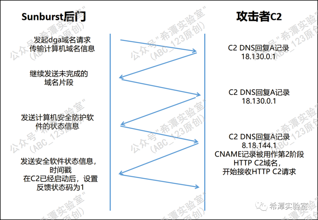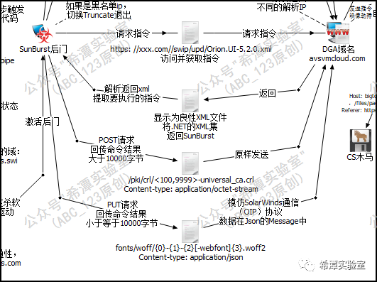 接下来ABC_123制作了一张流程图,演示了实战过程中C2端如何通过控制DGA域名解析到不同IP来控制Sunburst后门行为的全过程。由于该通信过程非常复杂,后续ABC_123会专门写一篇文章详细讲解全过程。
