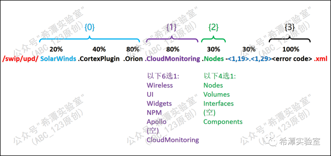 Sunburst后门对于URL请求的变换主要在于标黄的部分:/swip/upd/<random components>.xml。<random components>的取值算法比较复杂,每一小段设置了不同的比例被随机选取到。值得注意的是,error code的最后一位数字不是随机字符,取值为0或者1,表示上一步执行命令请求的是否成功。其中通常 0 表示成功,1 或其它值表示错误,最后加上.xml后缀。