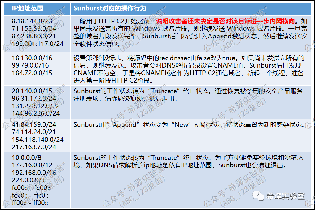 4. 该APT组织通过将C2域名解析到不同的IP地址段,间接控制Sunburst后门的操作,这个攻击行为在流量审计中难以发现。