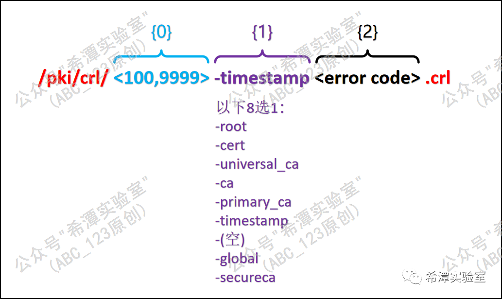 请求URI路径格式为/pki/crl/{0}{1}{2}.crl,其中{0}是100到10000的随机数;{1}是一个内置的字符串列表,从中随机选择一个进行拼接;{2}表示上次请求的错误码,某些情况下此值为空;最后在URL结尾拼接上.crl后缀。