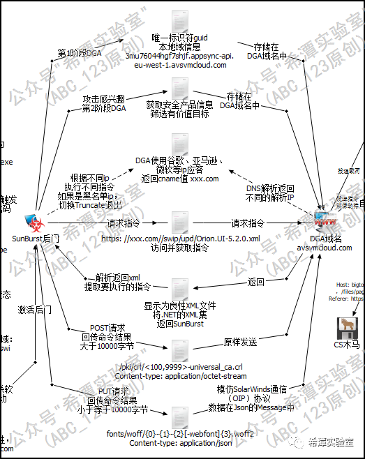 大家好,我是ABC_123。上周写了一篇《史上最严重的APT供应链攻击事件,借助Solarwinds攻击欧美的流程图梳理和分析(上篇)》反响还不错。由于该APT供应链攻击事件极其复杂,所以大约需要写5至6篇文章。本期继续分享第2篇,讲述其中用到的Sunburst后门的设计思路,以及它如何实现绕过流量检测的。