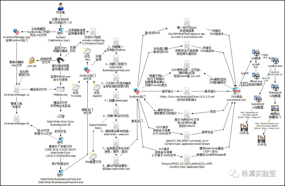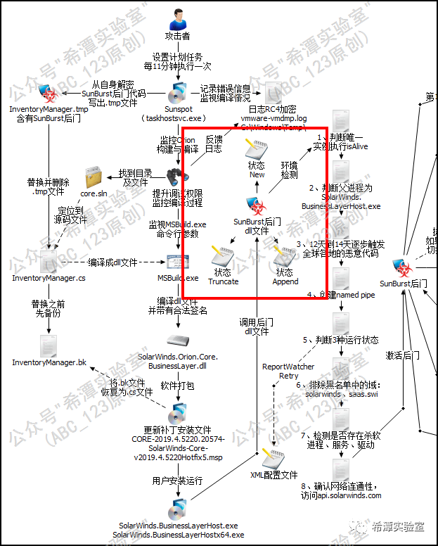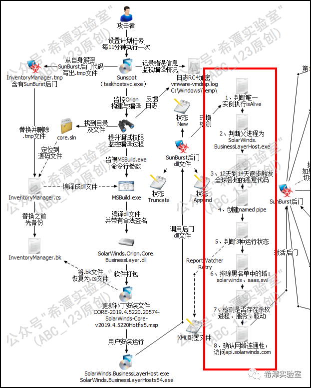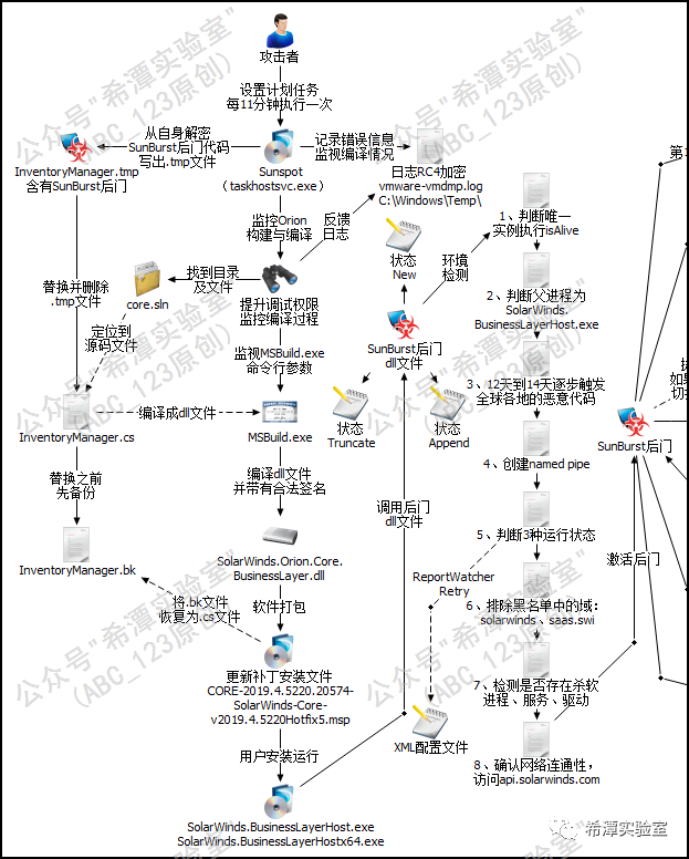 按照惯例,首先放出一张ABC_123绘制的关于Solarwinds供应链攻击事件中Sunburst后门的设计思路及流程图,是从大量的Sunburst后门样本分析文章中归纳整理出来的,接下来依据此图,详细讲解整个后门工作过程。