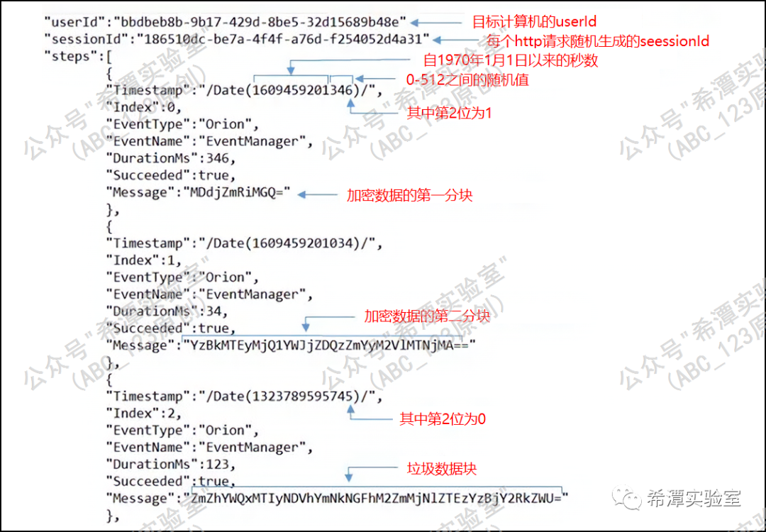 3. Sunburst在HTTP C2通信阶段,回传受害者电脑敏感信息时,把这些信息加密存储在XML程序集文档中或者JSON文档中,有时候还特意模仿Solarwinds专用协议的通信流量,这种方式在流量审计中难以发现。