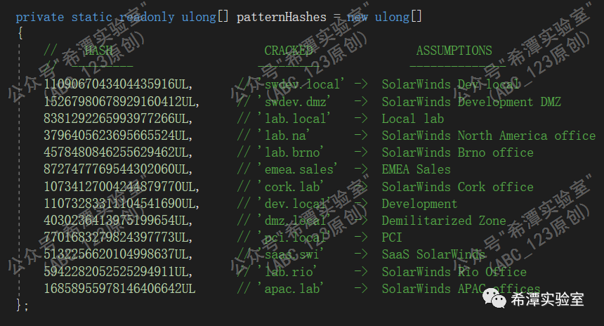 1. 获取AD域并通过Hash和正则判断是不是黑名单中的值,如swdev.local,swdev.dmz、saas.swi等,其中swi对应着"SolarWInds Internal",swdev对应着"SolarWinds Develop"。2. 不能包含solarwinds 关键字。3. 该域名不得与正则表达式(?i)([^a-z]|^)(test)([^a-z]|$)匹配,简单来说,它不能看起来像是一个测试环境域名。