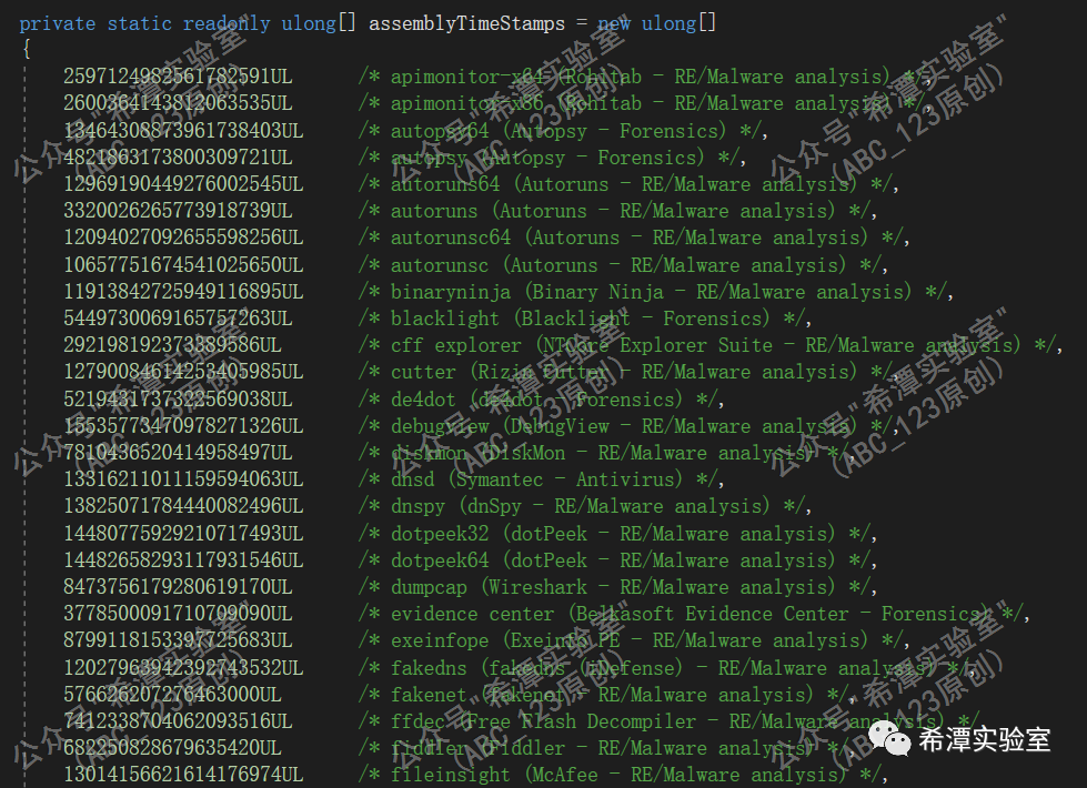 通过SearchAssemblies方法检查是否有进程黑名单,查看是否有Windbg、Winhex、Autoruns、Wireshark、dnSpy、apimonitor-x64、fiddler、idaq64、ollydbg、procdump64、x64dbg等进程存在。