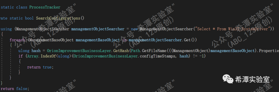 通过SearchConfigurations方法调用WMI查询,Select * From Win32_SystemDriver检测是否有驱动黑名单,比如groundling32.sys等。