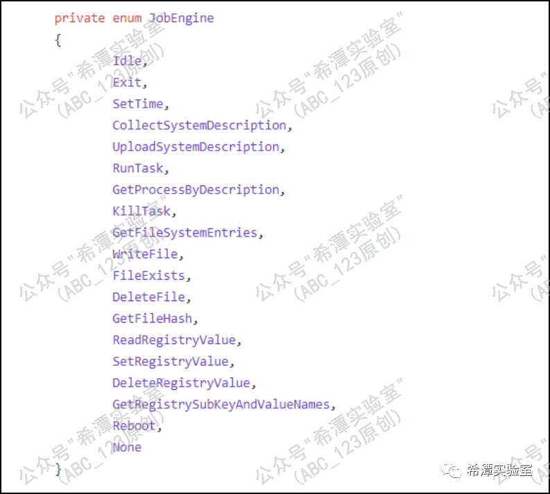 如上图所示,Sunburst开发者将IP地址定义在一个AddressFamilyEx结构中,Sunburst将会根据DNS解析返回的不同IP地址触发不同的恶意行为。通过阅读Sunburst后门的C#代码发现,根据C2将域名解析到不同类别的ip地址,Sunburst后门将执行大约5大类型的操作: