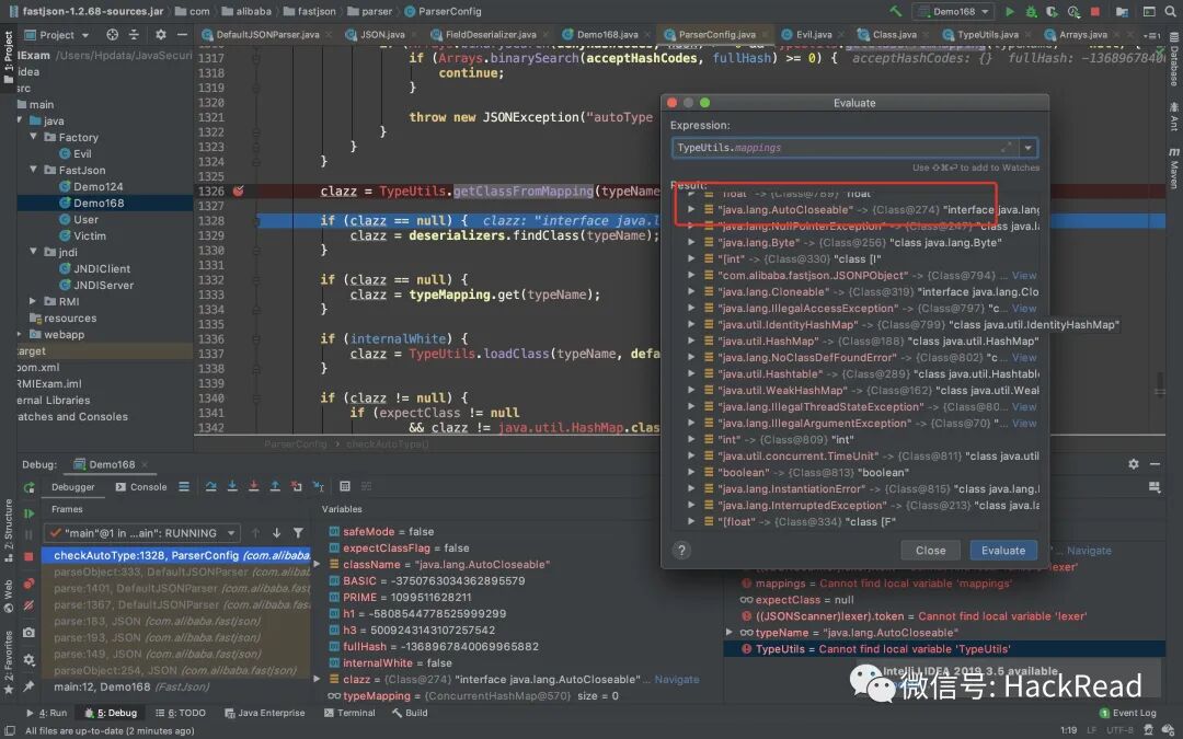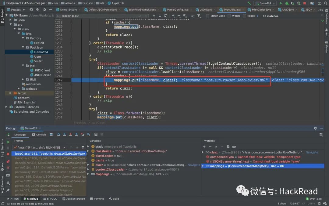 parseObject调用config.checkAutoType解析第一个@type指向的组件时,可以从TypeUtils.mappings里找到并返回