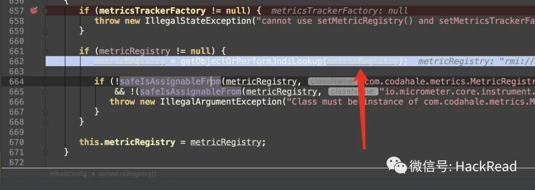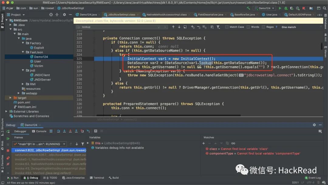 默认没有autoType,但是先进行了黑名单比对后再TypeUtils.loadClass,而在TypeUtils.loadClass中可以将”L”除去导致上一步的黑名单bypass。例如Lcom.sun.rowset.JdbcRowSetImpl最终被处理成为loadClass的参数:com.sun.rowset.JdbcRowSetImpl