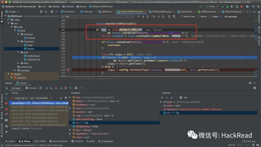 从v1.2.25开始,fastjson默认关闭了autotype支持,只加载白名单中的类。这里本地1.53环境自然默认没有AutoType,走一遍解析JSON的主要操作。