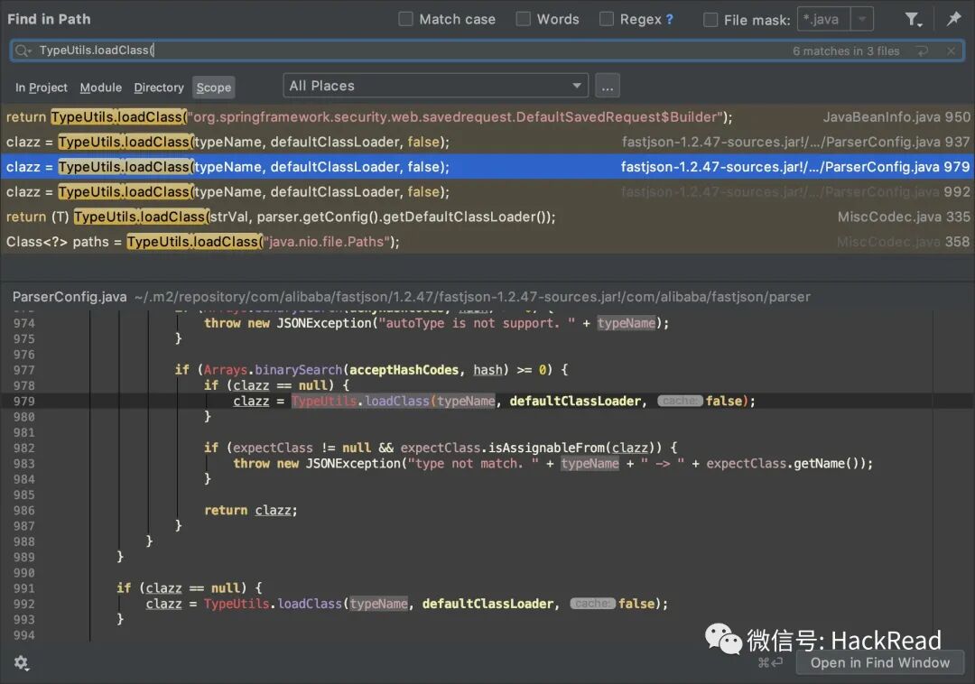 设置ParserConfig.global.setAutoTypeSupport(true);,前面的操作和关闭aotutype相同,直接将断点下在TypeUtils.loadClass并跟进