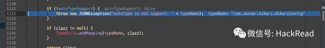 代码继续向下走,进入关键的一步。由于我们利用的组件不在白名单中,此处的clazz==null依然成立,但是autoTypeSupport || jsonType || expectClassFlag三者皆为false,无法进入判断,自然也不会对组件进行loadClass