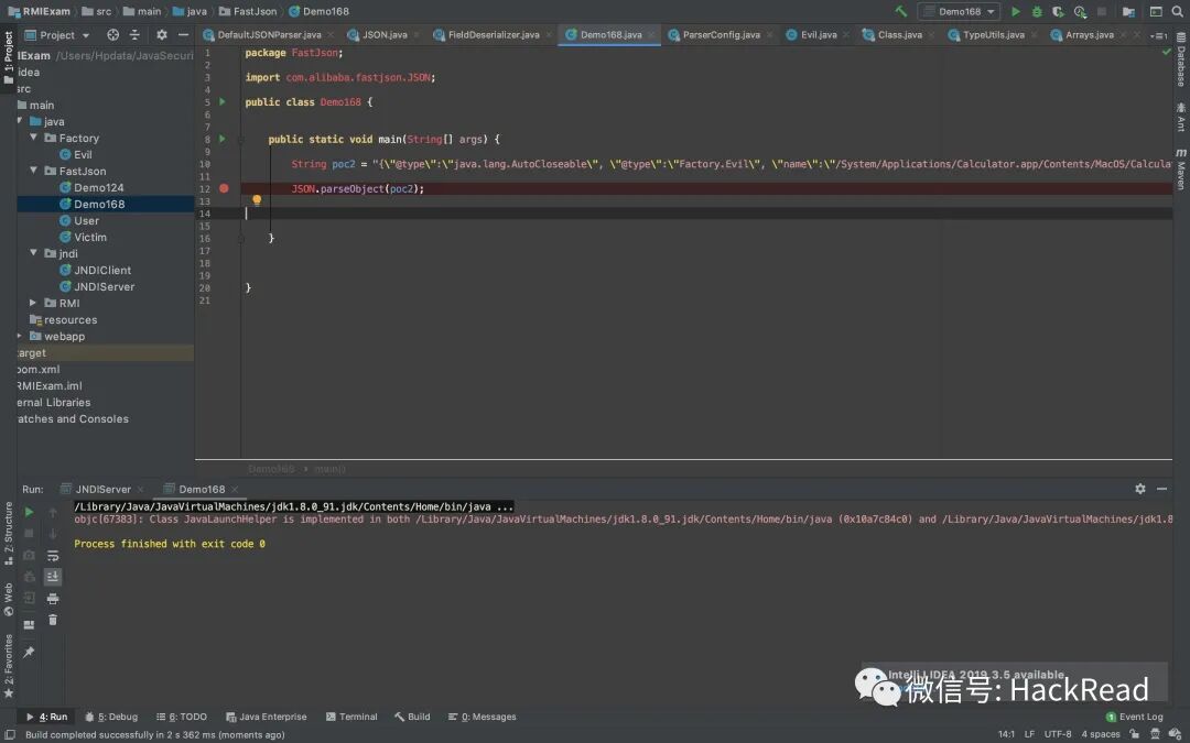 恶意工厂类编译、放置与上述操作相同,要注意如果自己创建JNDI SPI Server,那么绑定到codebase上的类名可以自定义包结构,也就是增加package名。但是marshasec转发到codebase上的恶意类,必须要求无任何package