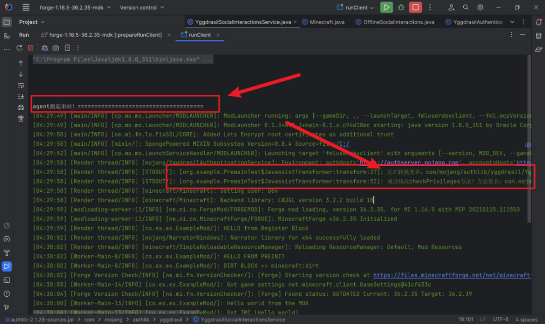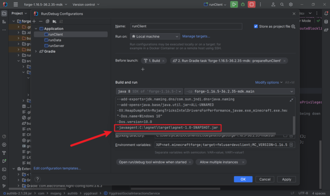 回到forge项目(或者启动器),运行参数加上-javaagent: