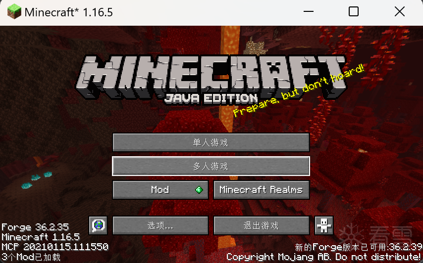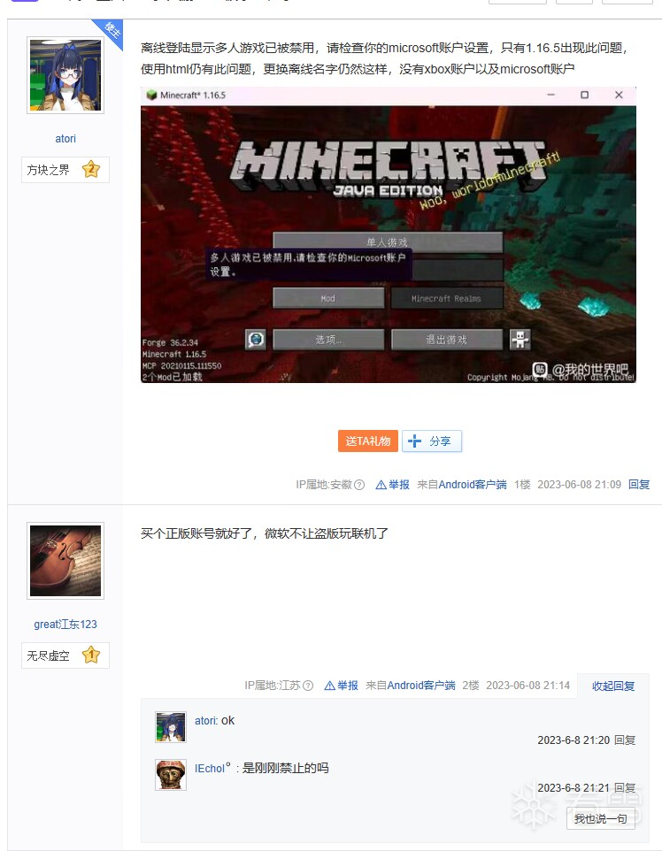 朋友玩服务器,发现从6.8日9:00开始1.16.5客户端无法进入多人模式。
