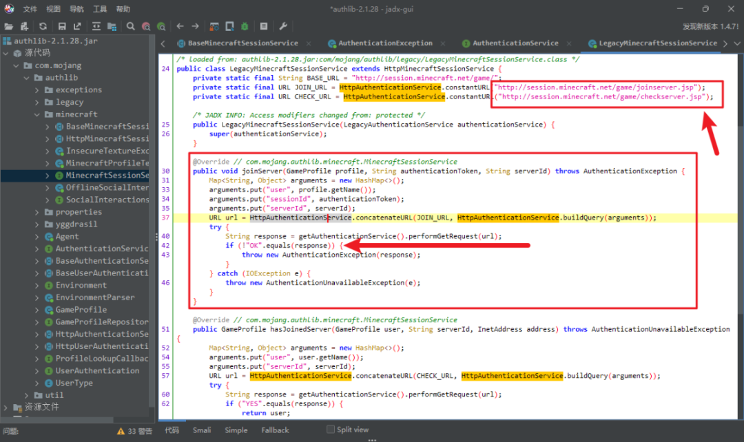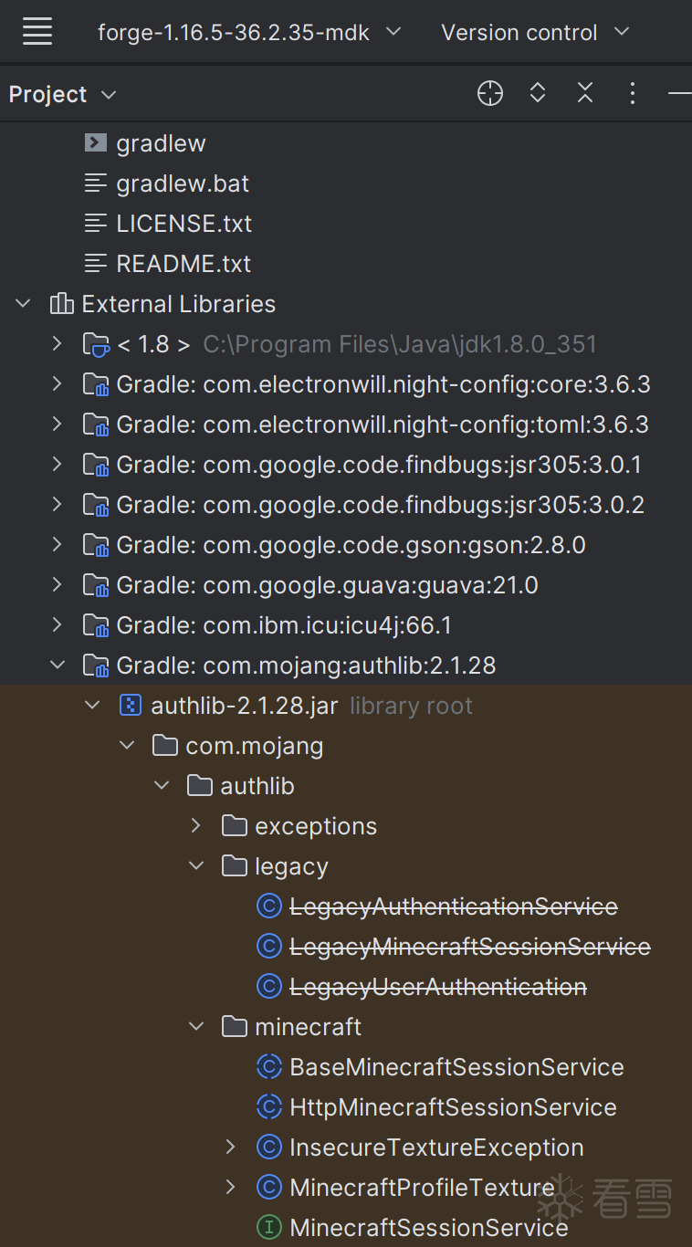 这里用了forge的开发环境,反混淆映射表是mapped_official频道的,可以看authlib包的源代码: