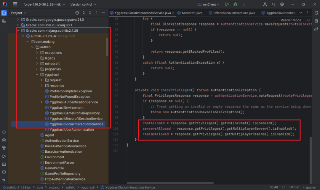 检查是否多人模式。跟进去,调用了authlib。socialInteractionsService是一个接口,通过工厂方法创建一个com.mojang.authlib.yggdrasil.YggdrasilSocialInteractionsService实例。发现这里就是判断是否允许多人登录的地方: