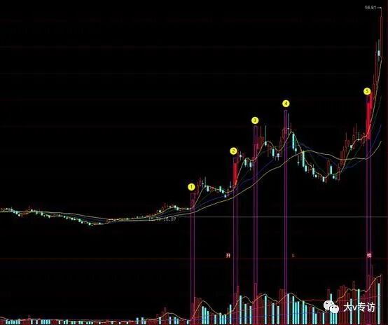 我们先以最近火热的太辰光这只股票为例,在之前的上涨当中,该股明显经历四浪的上涨,1、2、3处都是放量突破前一浪的高点,选择在当天买入,短线都有不错的收获,而第4的位置,股价突破前面一浪高点时,量能相对3处是缩量的,所以这里短线买入是失败的。股价在经历较大幅度的回落之后,6月9日股价放量再度突破4浪的高点,这里的量能比前面1、2、3、4的高点都高,所以突破是有效的,股价随后也经历了一波大涨。