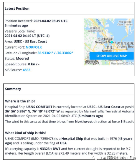 在实时追踪船舶位置的应用 MarineTraffic 上检索两艘船的 信息,“安慰”号当时的位置在弗吉尼亚诺佛克母港,处于停泊状态(Moored)。