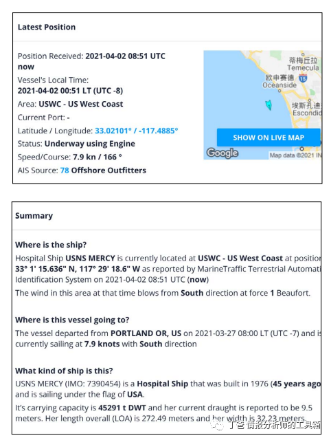 根据美国海军军事海运司令部发言人当时告诉 USNI 新闻的 说法,“仁慈”号的大修计划在 2021 年春季完成,随后进行一个月的海试和维护后的其他测试和训练 493 因此,美国海军“安慰”号医疗舰当时位于弗吉尼亚诺佛克母港,处于停泊状态。“仁慈”号在美国西海岸以 8.1 节 的速度向南航行,但其任务是进行大修后的海试和训练, 而非前往苏伊士运河。(参考阅读:https://chinafactcheck. com/?p=4154)