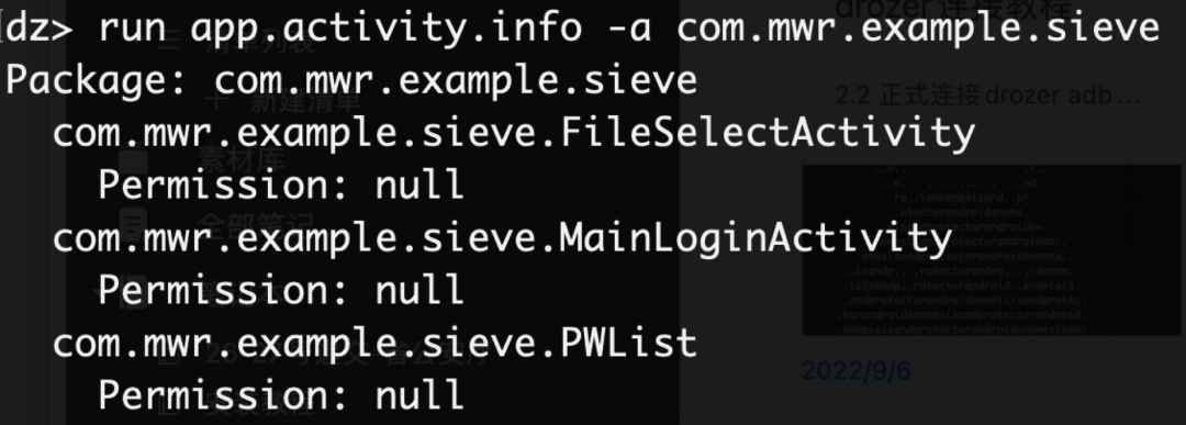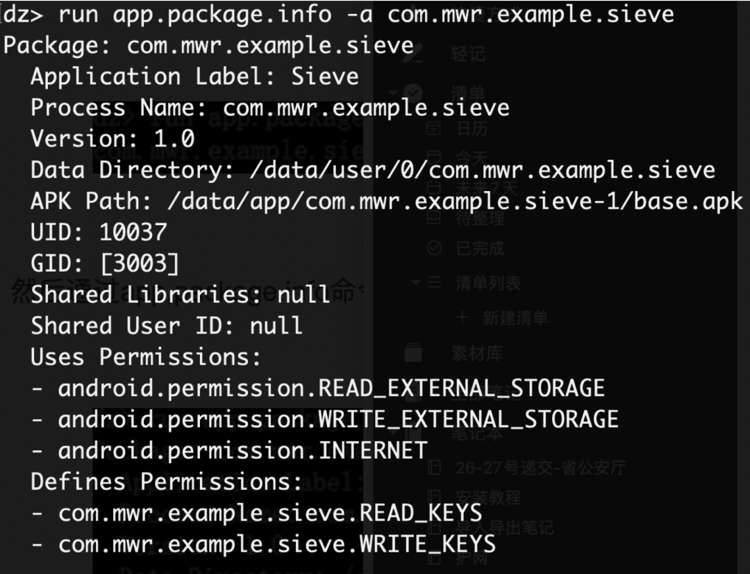 执行run app.package.info -a com.mwr.example.sieve查看待测APP详细信息,包括版本,app在设备中保存数据的地方,app安装的位置以及关于应用权限的大量细节。