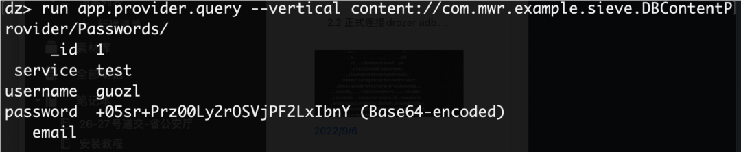 扫描结果可以看到成功扫描出3条可读取目录文件,使用其他的drozer模块从目录URI中获得信息,甚至可以修改数据库中的数据 执行命令run app.provider.query --vertical content://com.mwr.example.sieve.DBContentProvider/Passwords/