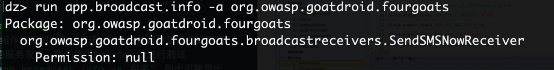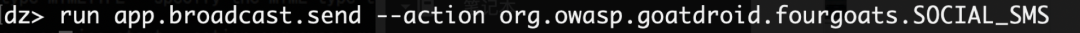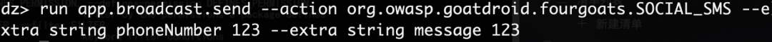 所以执行命令run app.broadcast.send --action org.owasp.goatdroid.fourgoats.SOCIAL_SMS --extra string phoneNumber 123 --extra string message 123