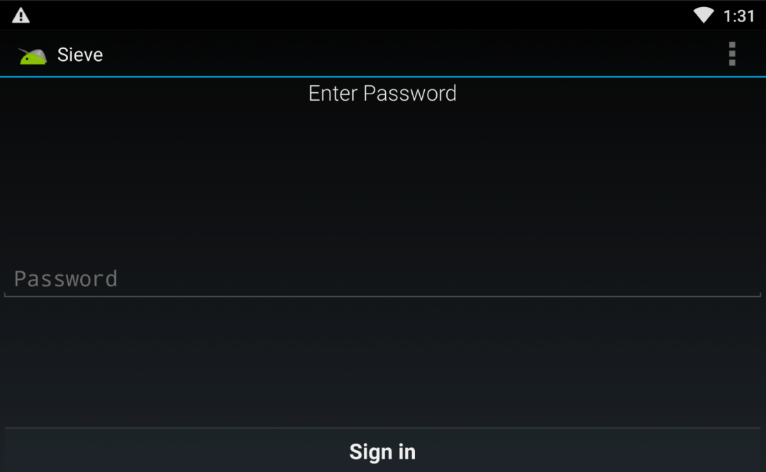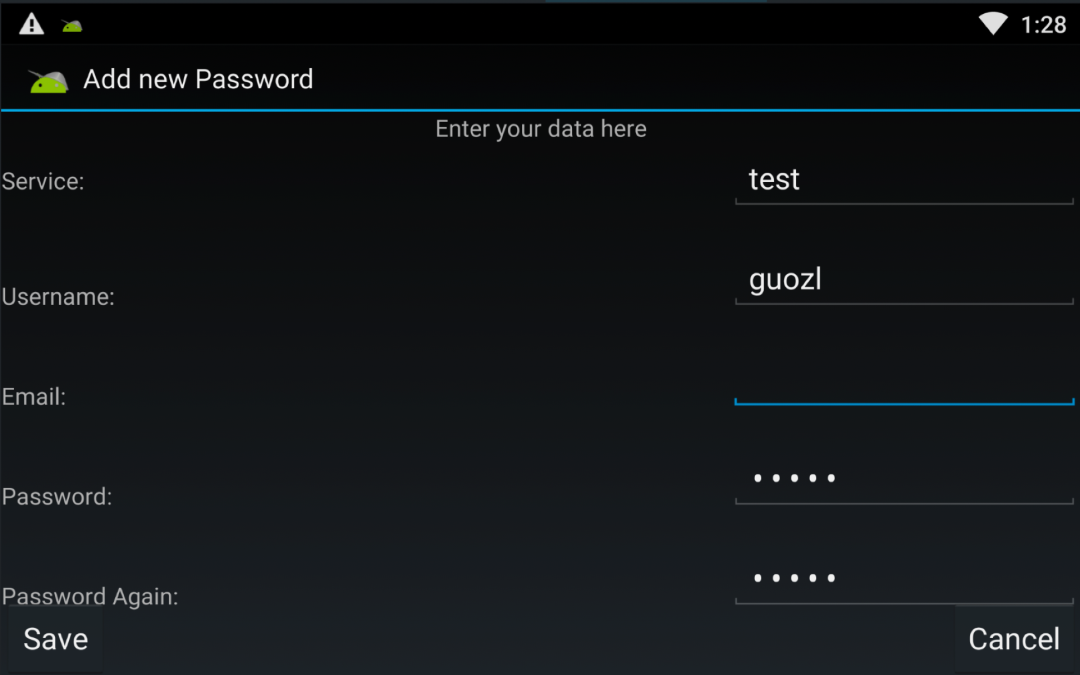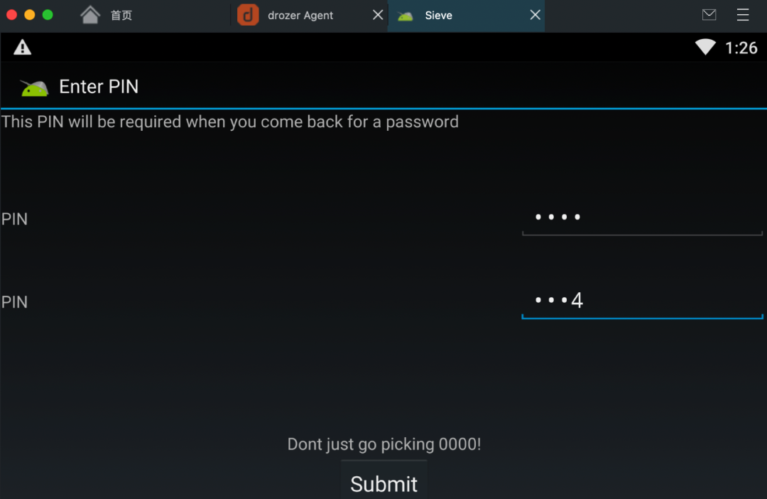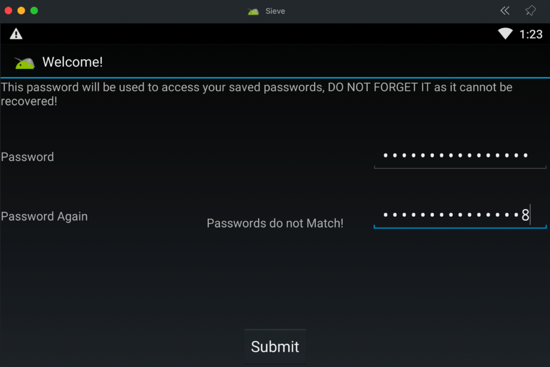 打开我们下载好的sieve应用程序,它是一款密码管理软件,专门被设计出来用于安卓应用常见漏洞的学习使用。首先需要设置16位的masterpassword,为演示方便密码设为:1234567812345678