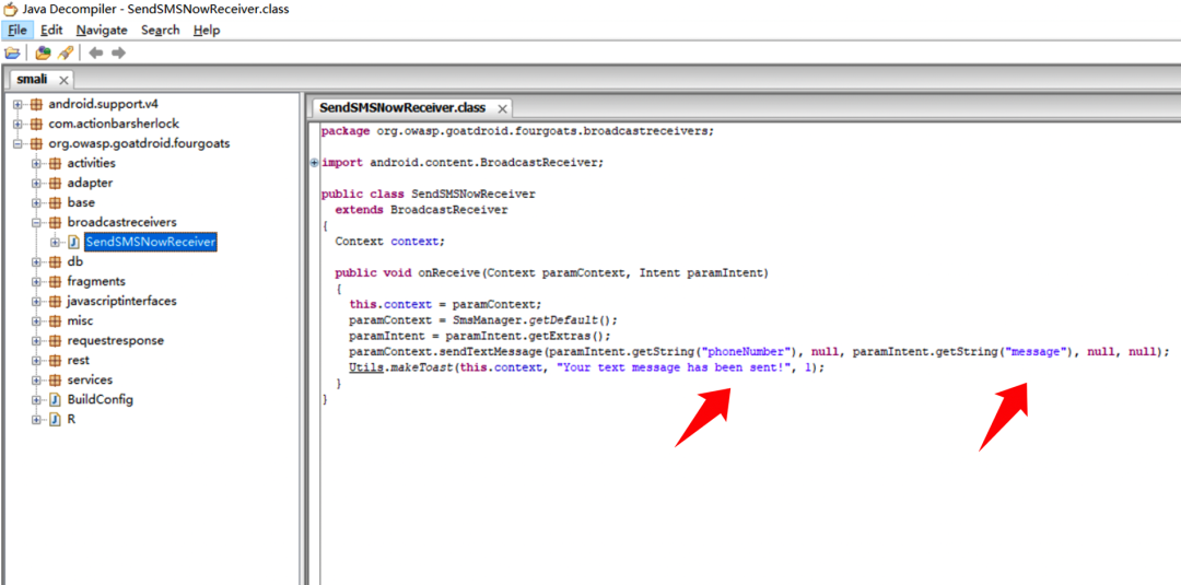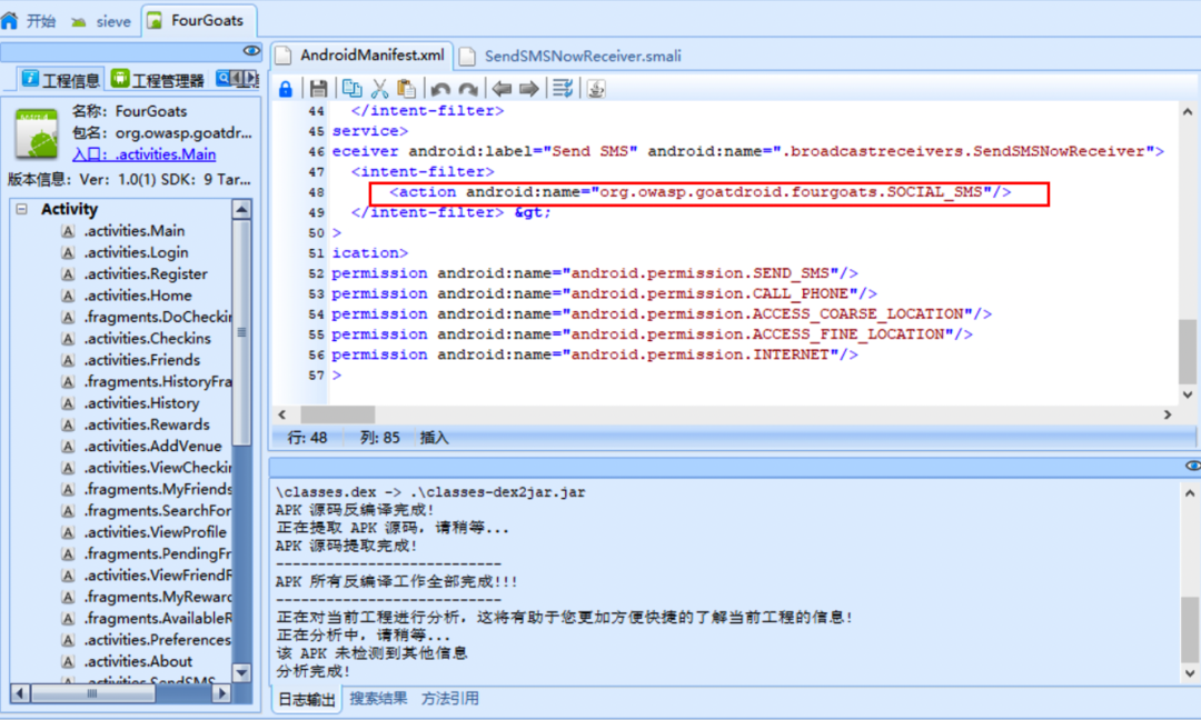 1. 发送恶意广播 由于运行broadcast组件需要找到其对应的action,所以我们需要反编译app,使用android killer对其反编译,并在AndroidManifest.xml中找到对应actionorg.owasp.goatdroid.fourgoats.SOCIAL_SMS。