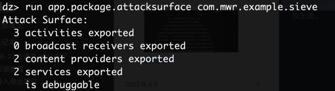 执行run app.package.attacksurface com.mwr.example.sieve命令,来获取针对待测app sieve的攻击面。activities exported 越权攻击,发送伪造消息等;broadcast receivers exported 发送恶意广播,伪造广播消息,越权攻击等;content providers exported 数据泄漏,SQL注入等;services exported 越权攻击,服务拒绝,权限提升等;