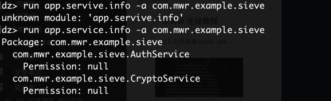 执行命令run app.service.info -a 包名。列出可被导出的基本service信息,可以看到AuthService和CryptoService可被导出。