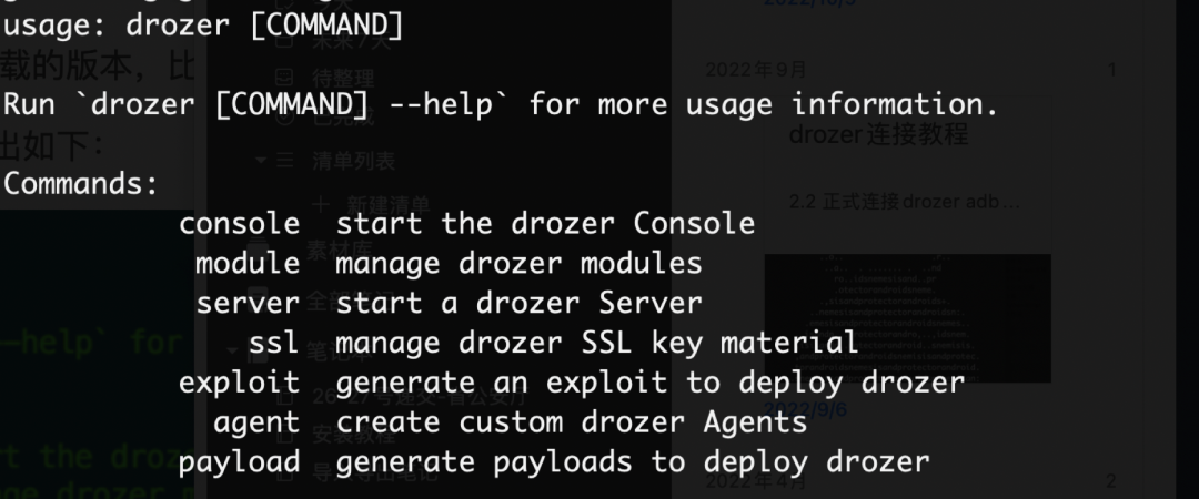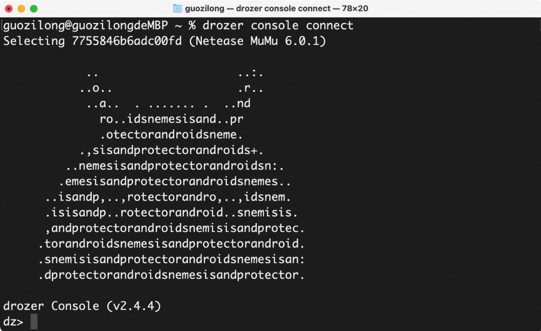 打开新的终端窗口,执行命令drozer console connect出现以下画面,显示连接成功