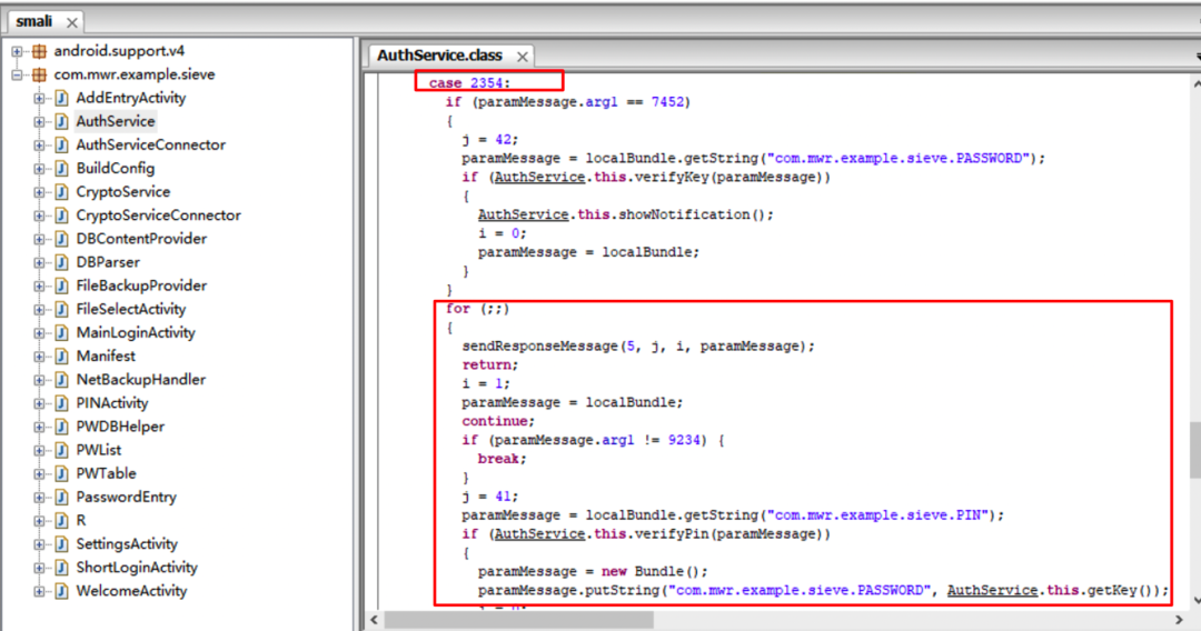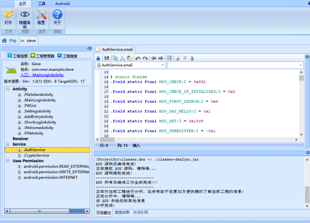 我们可以直接获取其初始密码,其中 --msg what arg1 arg2指定获取消息时要使用的what、arg1和arg2值 我们可以利用android killer反编译工具对sieve进行反编译