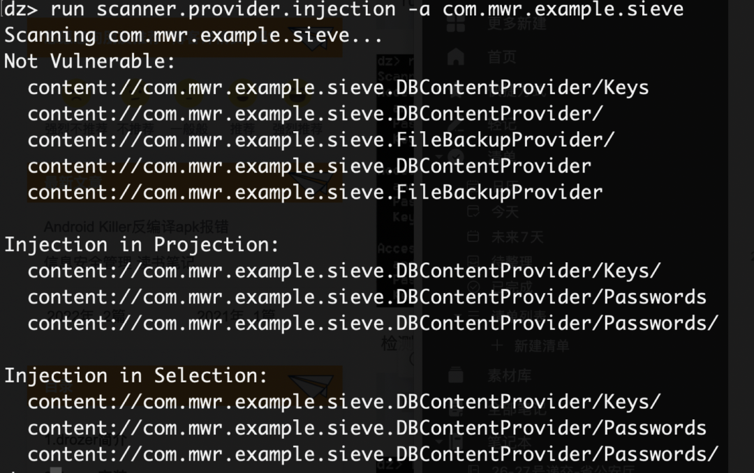 成功读取出sieve加密后初始密码及pin码等 2. SQL注入 因为安卓平台比较推荐使用SQLite数据库存储用户数据,我们可以查找可进行sql注入的URIs 执行命令run scanner.provider.injection -a 包名