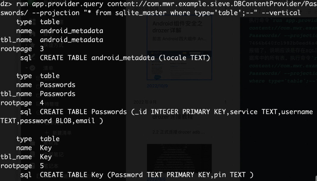 报错了,说明应该是存在SQL注入的,通过构造注入语句,来列出数据库中的所有表。执行命令run app.provider.query content://com.mwr.example.sieve.DBContentProvider/Passwords/ --projection "* from sqlite_master where type='table';--" --vertical