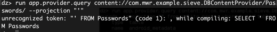 可以看出Projection参数和Selection参数均存在注入,我们使用projection参数传递sql注入语句到content provider中 执行命令run app.provider.query content://com.mwr.example.sieve.DBContentProvider/Passwords/ --projection "'"