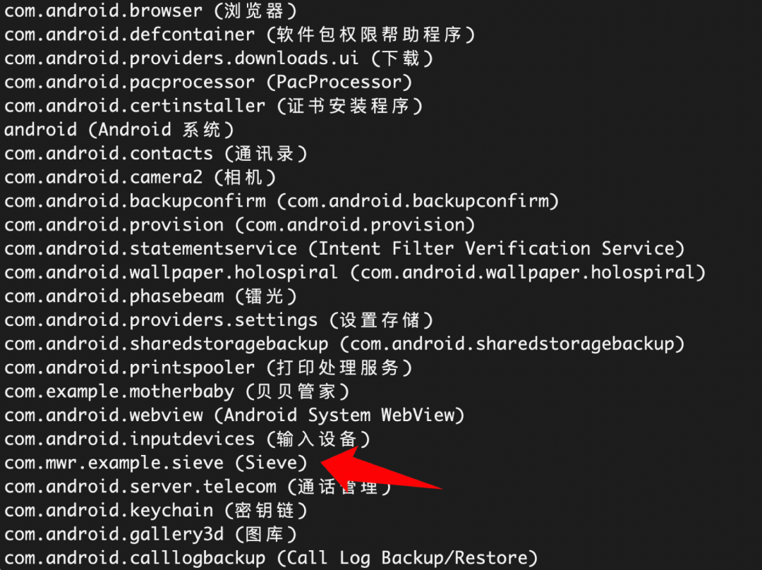 首先我们执行run app.package.list 列出设备中所有安装的应用程序 从中我们可以发现sieve的包名信息