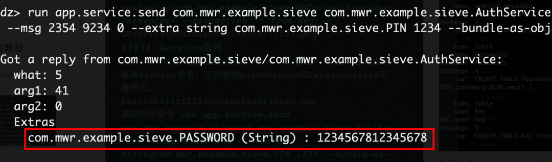 通过执行命令run app.service.send com.mwr.example.sievecom.mwr.example.sieve.AuthService --msg 2354 9234 0 --extra stringcom.mwr.example.sieve.PIN 1234 --bundle-as-obj