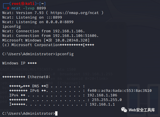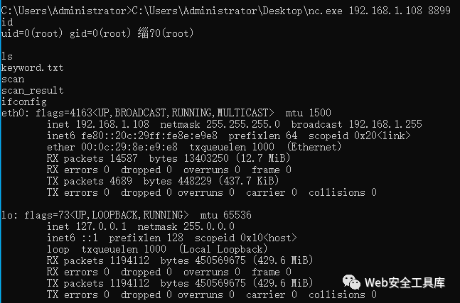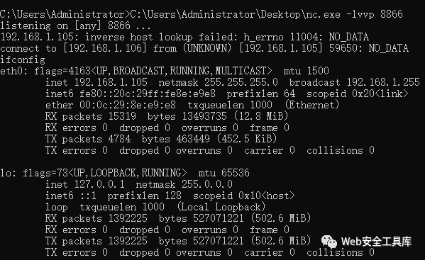 3、windows服务器上执行ifconfig命令,成功获取Linux服务器相关信息