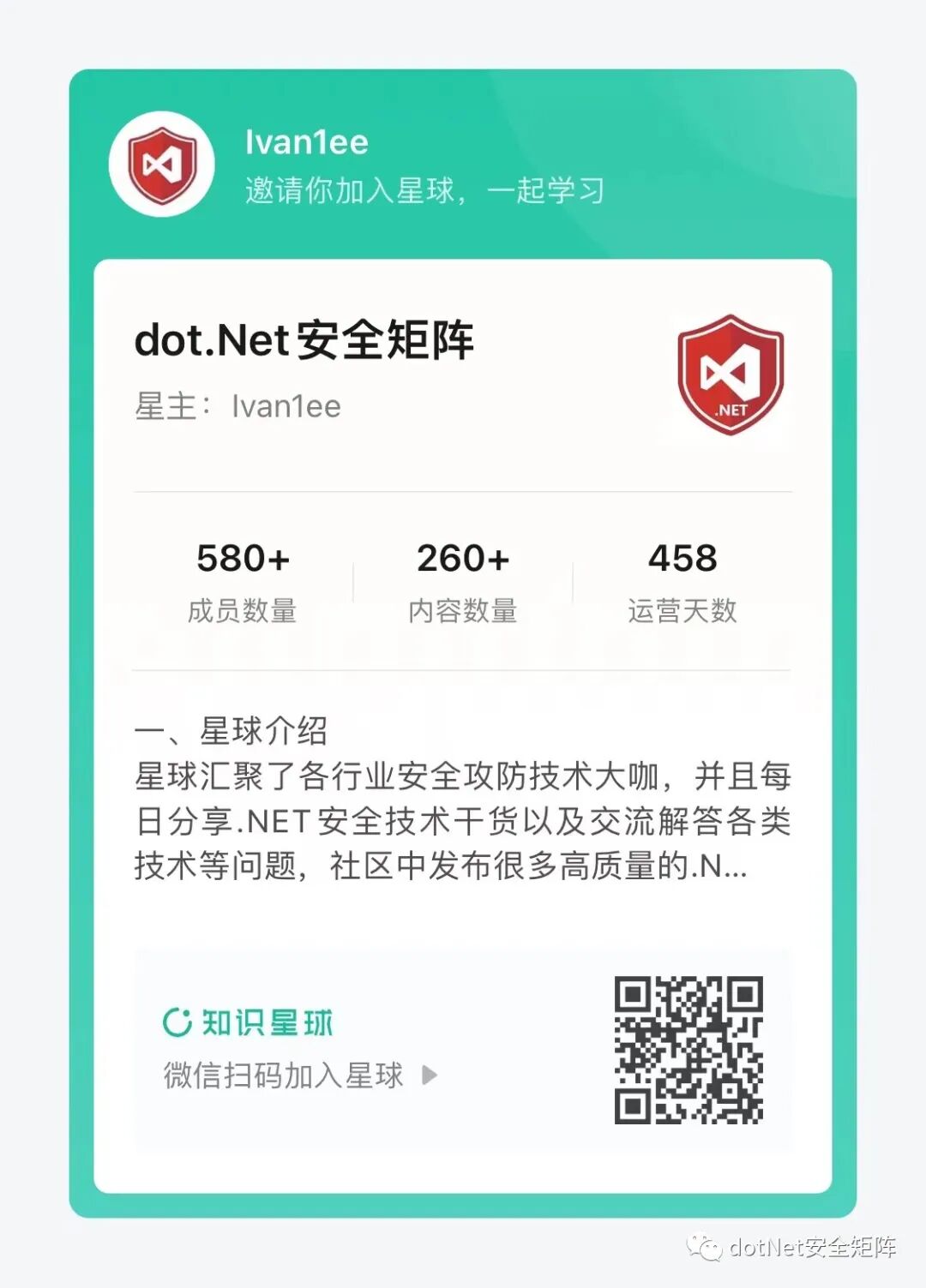 dotNet安全矩阵知识星球 — 聚焦于微软.NET安全技术,关注基于.NET衍生出的各种红蓝攻防对抗技术、分享内容不限于 .NET代码审计、 最新的.NET漏洞分析、反序列化漏洞研究、有趣的.NET安全Trick、.NET开源软件分享、. NET生态等热点话题、还可以获得阿里、蚂蚁、字节等大厂内推的机会.