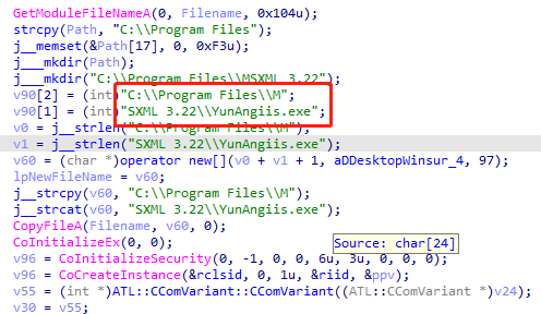 2.样本将自己复制到Program Files\MSXML 3.22文件夹内,该种方式已在银狐历史使用的恶意载荷中出现非常频繁。![]()