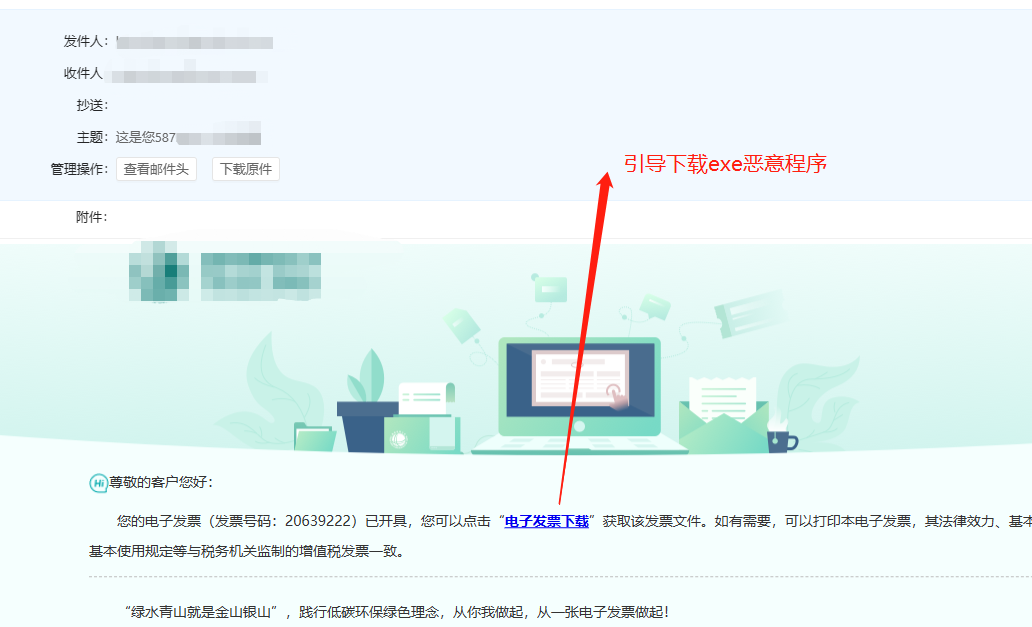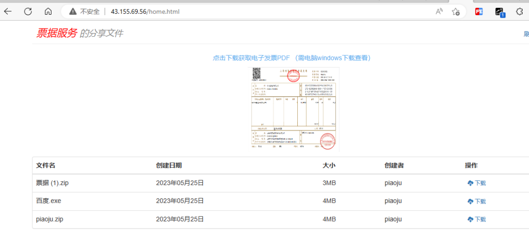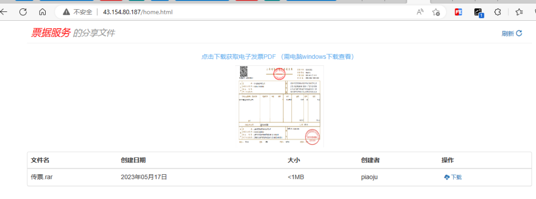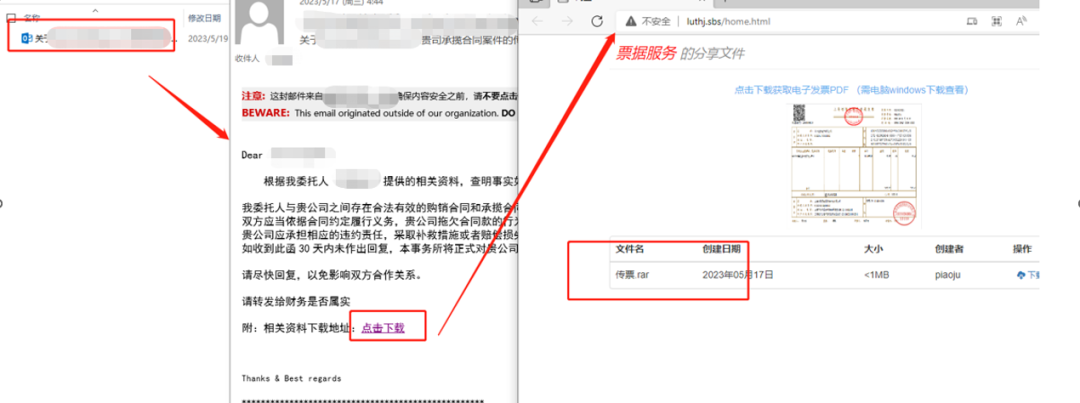 银狐使用钓鱼邮件样本进行钓鱼,相关的钓鱼邮件如下所示,跳转到票据分享的钓鱼网页,诱导下载相关恶意文件后安装执行。此外银狐还伪装成国内某能源公司发送伪造的电子发票邮件,诱导受害者下载相关的恶意文件并执行。![]()